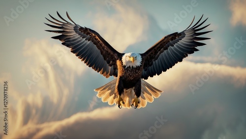 Obraz premium Majestic bald eagle soaring against a backdrop of clouds during golden hour