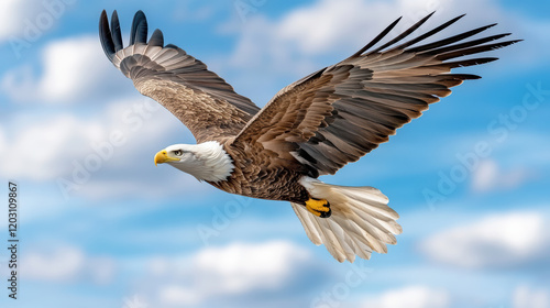 Obraz premium Majestic bald eagle soaring gracefully against clear blue sky