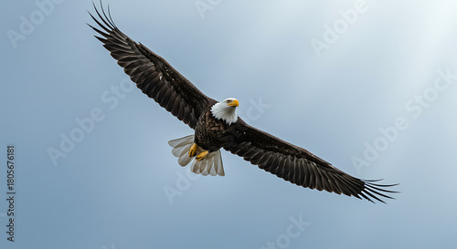 Fototapeta premium Majestic bald eagle soaring gracefully through the clear, bright, blue sky.