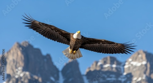 Naklejka premium Majestic Bald Eagle Soaring High Over Snow-Capped Mountains in Clear Blue Sky. Powerful wildlife symbol of freedom, strength, and American pride. Dynamic flight