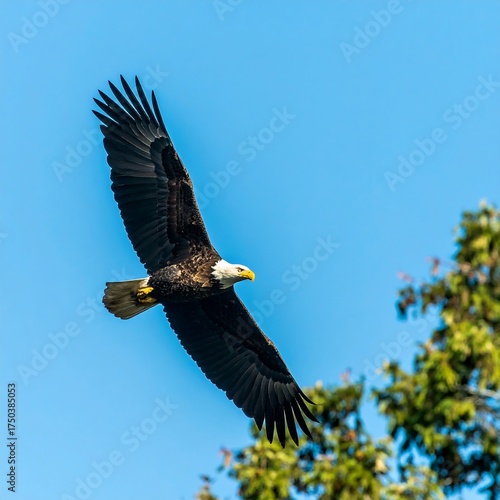 © Halal, Fototapeta premium Majestic Bald Eagle Soaring in a Clear Blue Sky