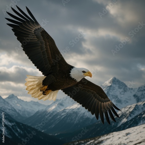 Obraz premium Majestic bald eagle soaring in the sky over dramatic snowy mountain peaks with stormy clouds