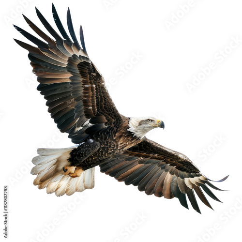 © Kan, Naklejka premium Majestic bald eagle soaring in the sky with outstretched wings, showcasing its powerful feathers and graceful flight against a clear background.