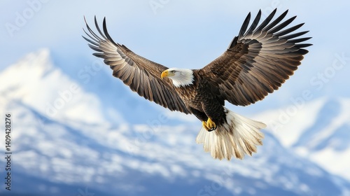 Obraz premium Majestic bald eagle soaring over snow-capped mountains under a clear blue sky...