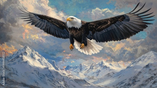 Fototapeta premium Majestic Bald Eagle Soaring Over Snowy Mountains