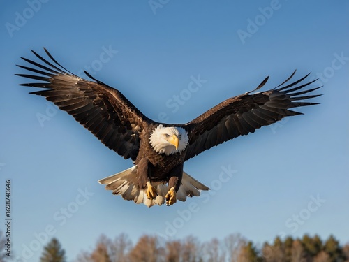 © Andreas, Obraz premium Majestic Bald Eagle Soaring Through Blue Sky