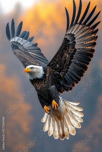 © boler, Obraz premium Majestic Bald Eagle Soaring Through Sunset Sky