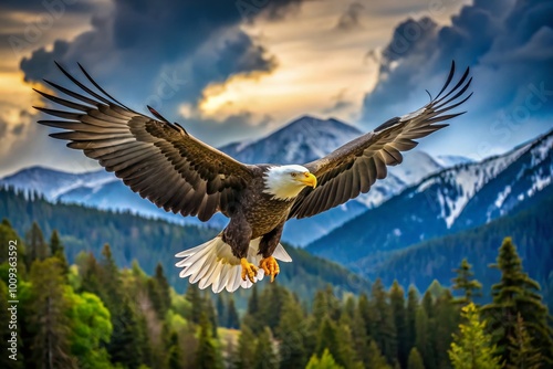 Obraz premium Majestic Bald Eagle Soaring Through the Sky with Powerful Wings and Stunning...