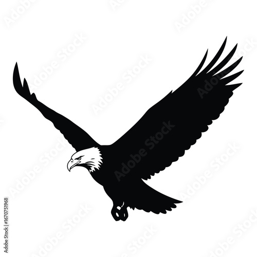 © JESMIN, Obraz premium Majestic bald eagle soaring through the sky with wings spread wide in a powerful flight silhouette