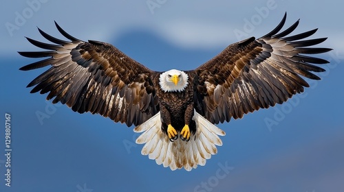 © Raitalinn, Fototapeta premium Majestic Bald Eagle Soaring with Wings Outstretched Against Blue Sky