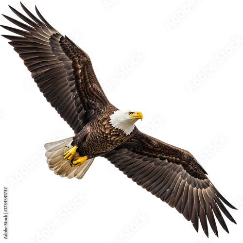 © usamamajeed, Naklejka premium Majestic bald eagle soaring with wings spread against a black background