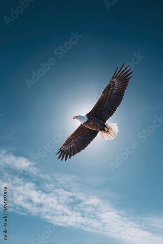 © SolaruS, Naklejka premium Majestic bald eagle soars through a clear blue sky, wings spread wide, symbolizing freedom, strength, and vision. Perfect for conveying powerful messages or concepts.