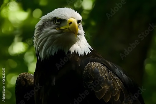 © febialus, Obraz premium Majestic bald eagle with sharp gaze, perched in a forest.