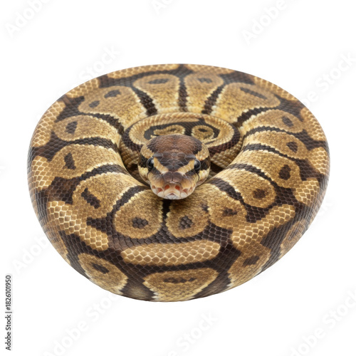 © Gustav, Obraz premium Majestic Ball Python Coiled Patterned Reptile Against A Stark Black Background