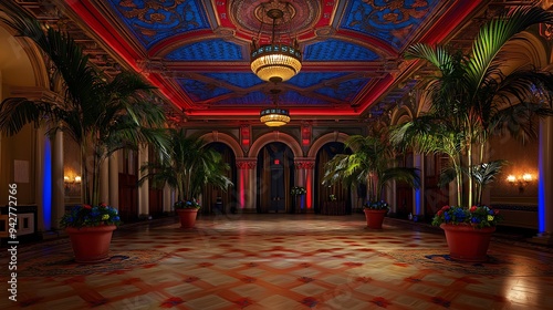 Obraz premium Majestic Ballroom Decorated with Potted Palm Trees, Intricate Ceiling, and Warm Lighting with Red and Blue Accents