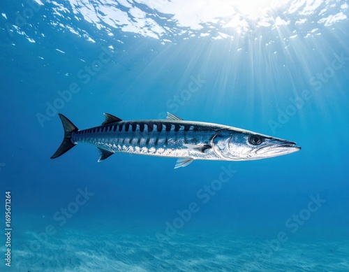 Fototapeta premium Majestic barracuda fish swimming in crystal clear blue ocean water with sunlight rays penetrating from surface above
