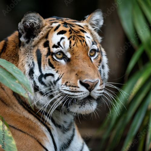 © MD, Fototapeta premium Majestic bengal tiger portrait amidst lush green foliage with captivating gaze and whiskers