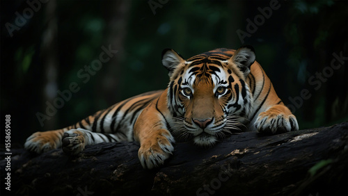 © Sayed, Obraz premium Majestic bengal tiger resting on a dark log in a lush forest