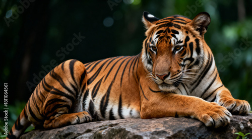 © RomanReigns, Naklejka premium Majestic Bengal Tiger Resting on Rock in Natural Forest Habitat