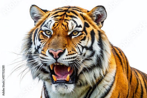 © Adisorn, Naklejka premium Majestic Bengal Tiger Roar, Fangs Bared, Isolated White Background PNG - Wildlife Stock Photo
