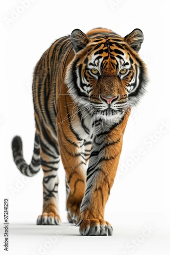 Fototapeta premium Majestic Bengal Tiger Walking Forward on White Background in High Detail