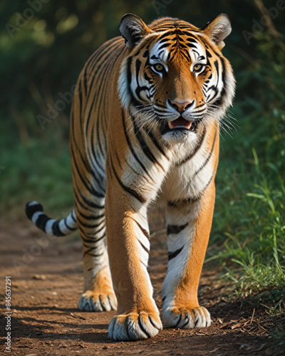 © shiv, Fototapeta premium Majestic Bengal tiger walking in the wild staring with aggression generated by artificial intelligence.