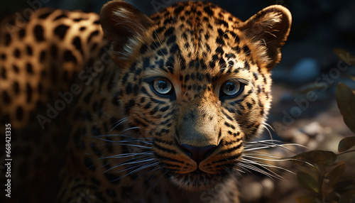 Fototapeta premium Majestic big cat staring, spotted in African wilderness, undomesticated generated by AI