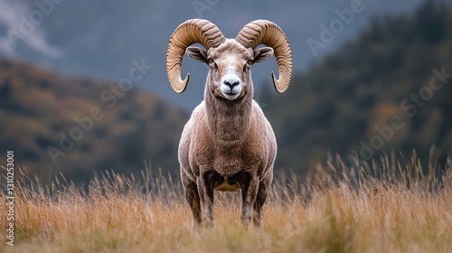 Naklejka premium Majestic Bighorn Sheep Ram in Autumn Grassland Wild Nature Powerful Horns Mountain Animal Wildlife Photography Scenic Landscape Image Beautiful