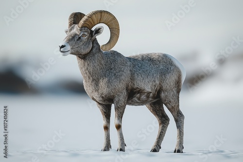 Naklejka premium Majestic bighorn sheep standing in snowy landscape with curved horns