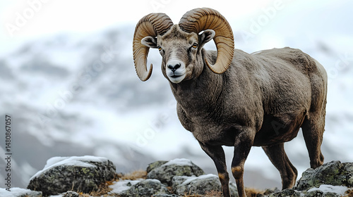 © cris, Naklejka premium Majestic bighorn sheep stands on rocky mountain peak, gazing directly at the viewer