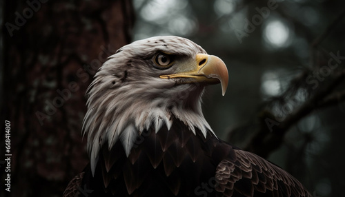 Obraz premium Majestic bird of prey perching on branch, looking at camera generated by AI