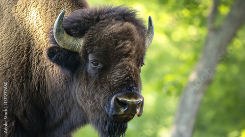 © Thanthara, Obraz premium Majestic bison with thick shaggy fur in lush green forest