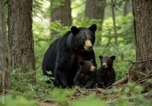 © Nurshuhadah, Fototapeta premium Majestic black bear and her two playful cubs exploring the lush forest environment surrounded by trees and greenery on a sunny day