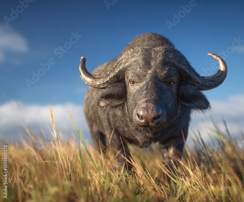 © donwakarn, Naklejka premium Majestic Black Buffalo Standing Proudly in Lush Green Field Surrounded by Tall Grass Under a Bright Blue Sky Evoking a Sense of Freedom and Nature