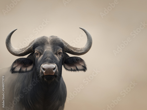 Naklejka premium Majestic black buffalo with large curved horns stands confidently against a soft, blurred background, showcasing its powerful presence and natural beauty in a serene environment