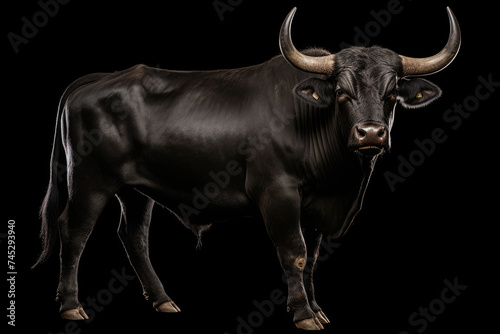 © Piotr, Naklejka premium Majestic Black Bull With Large Horns in the Dark