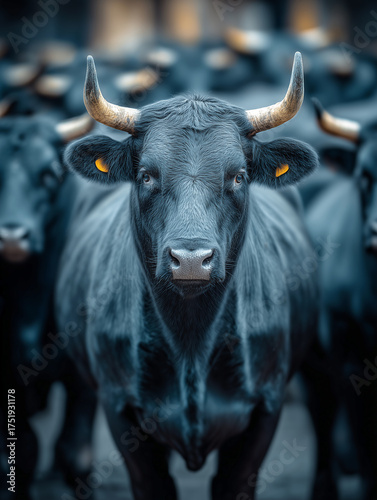 © Poj, Naklejka premium Majestic black bulls with golden horns standing boldly in a herd during dusk camera shot