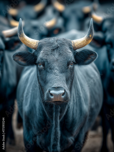 © Poj, Naklejka premium Majestic black bulls with golden horns standing boldly in a herd during dusk camera shot