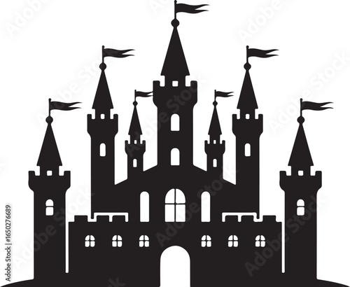 Obraz premium Majestic black castle silhouette with flags atop towers