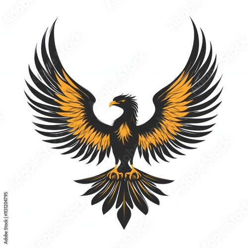 © lestari, Obraz premium Majestic black eagle with golden wings spread wide, isolated on white background.