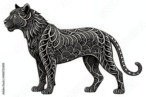 Fototapeta premium Majestic black panther, adorned in intricate swirling patterns, a symbol of grace and power, rendered in elegant black and white.