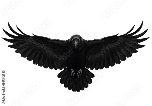 © RAMS, Fototapeta premium Majestic Black Raven in Flight: A Stunning Close-Up of a Raven with Wings Spread Wide Against a White Background