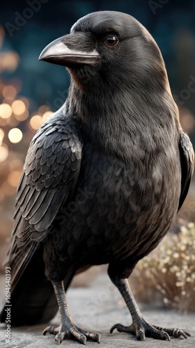 © pvl0707, Naklejka premium Majestic black raven perched in natural setting with subtle bokeh background during twilight
