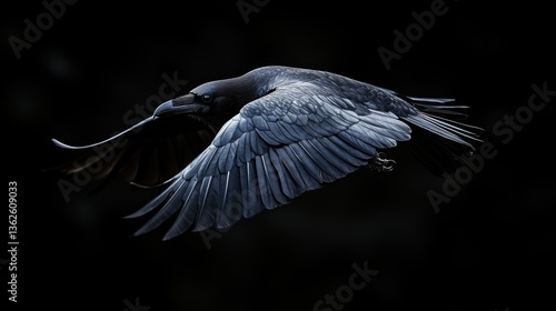 Naklejka premium Majestic black raven soaring through the dark sky in flight showing detailed...