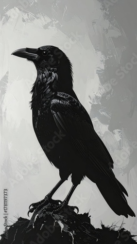 Fototapeta premium Majestic Black Raven Standing on Rock with Artistic Background