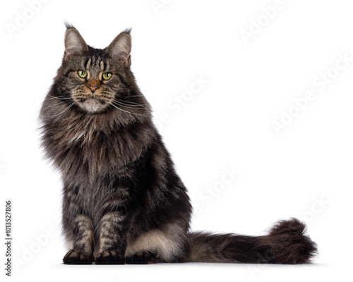© Nynke, Obraz premium Majestic black tabby Maine Coon cat sitting up side ways. Looking towards camera with greenish eyes. Isolated on a white background.