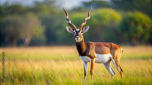 Naklejka premium Majestic blackbuck antelope standing gracefully in grassy field, wildlife,...