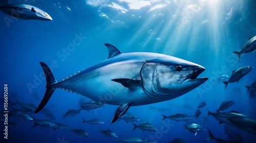 © ChrisTYCat, Fototapeta premium Majestic blackfin tuna swimming near a vibrant seamount teeming with diverse marine life in the depths of the tropical ocean