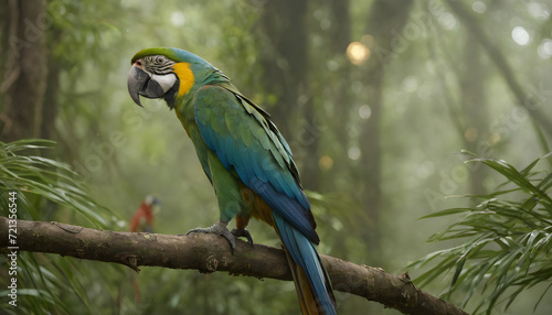 Obraz premium Majestic Blue and Yellow Macaw Perched in a Lush Rainforest Bathed in Sunlight