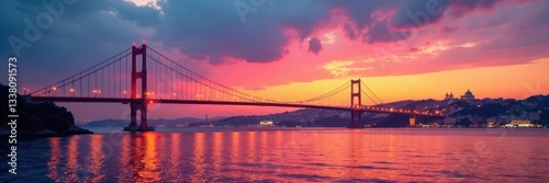 Obraz premium Majestic Bosphorus suspension bridge at sunset, travel, drone